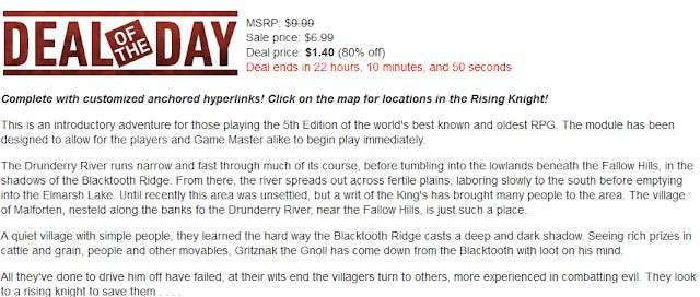 A0 The Rising Knight (5e Rules) - Troll Lord Games, major discount today, Only $1.40!The Evil Dungeon Master ๐Feb 23, 2017ShareThe deal of the day today is an introductory 5e adventure by Troll Lord Games, and its only $1.40?! How can you beat that! Head over to Drivethrurpg now!Check it out and buy it now!PreviousNext