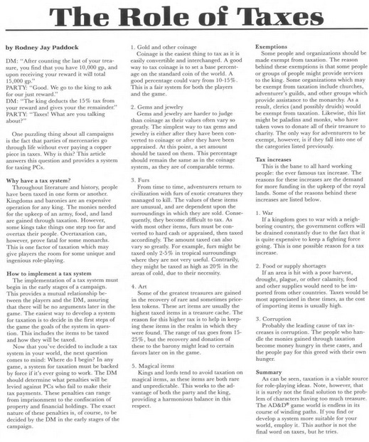 Taxes can also create story. Maybe the tax collector is corrupt. Maybe the party is asked to hunt down smugglers. Maybe the temple demands double tithes because of a holy war. Suddenly taxes are not just numbers. They are hooks.