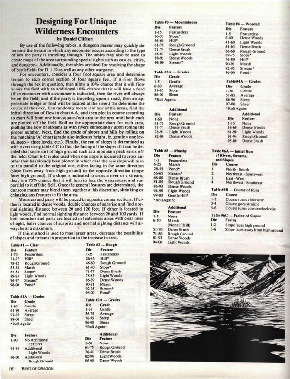 The article "Designing for Unique Wilderness Encounters" provides Dungeon Masters with tables and instructions to generate unique terrains and features for wilderness encounters. It focuses on integrating environmental diversity into gameplay by considering terrain types, grades, slopes, and features like streams, ponds, and vegetation. The goal is to create realistic and strategic battlefield setups, enhancing immersion in outdoor adventures.