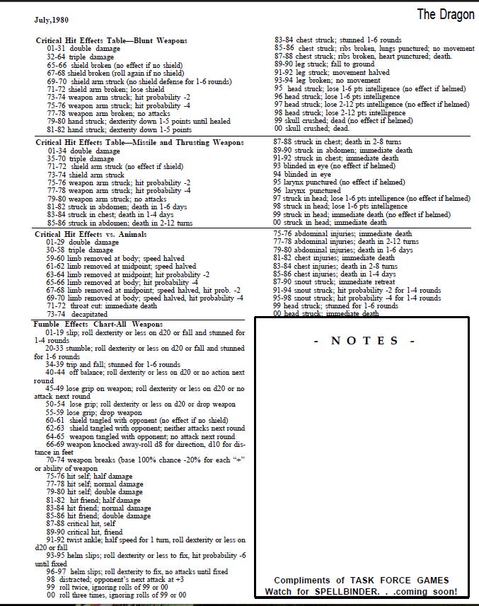 These tables gave flavor to every hit and miss. You had charts for bladed weapons, blunt weapons, missile weapons, even animals. Each one came with nasty surprises. Drop your weapon... smash your shield... lose your helm... or worse... bite your own tongue mid-swing and pass out from pain. Yeah, that’s in there.