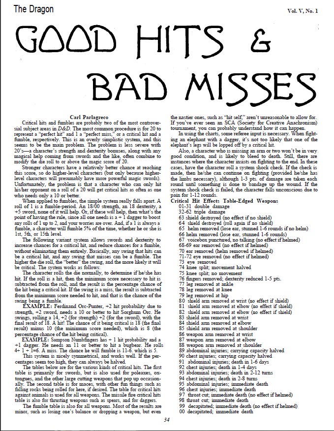 Back in the early days of The Dragon, before the internet told you how to play, there was a little gem in issue 39 that dared to do what the core rulebooks wouldn’t... give teeth to your dice. “Good Hits and Bad Misses” was a wild ride of critical hits and fumbles that turned your average sword swing into a brutal display of meat and mayhem.