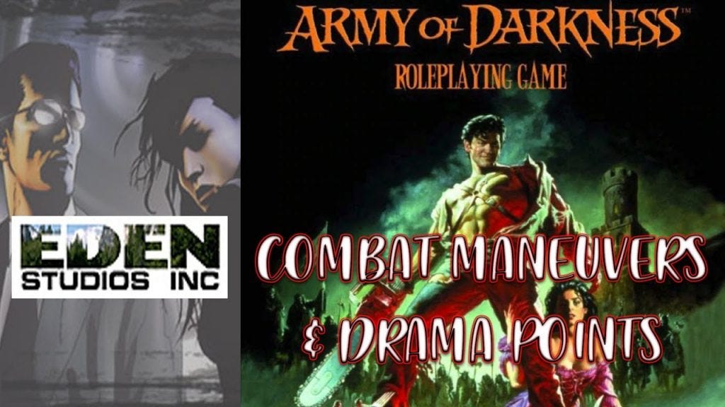 Today, I'm diving into the spine-tingling world of The Army of Darkness Roleplaying Game by Eden Studios. If you're a fan of the cult classic film series and love tabletop roleplaying games, this is a must-have addition to your collection. What sets the cinematic unisystem game apart are its unique mechanics, specifically Combat Maneuvers and Drama Points. Combat Maneuvers are basically a short cut to things you can do, and saves you the trouble of having to constantly add things up when rolling. Drama Points are a game-changer, quite literally. They can give you more health, they bring you back from the dead, they can even help you out of jam.