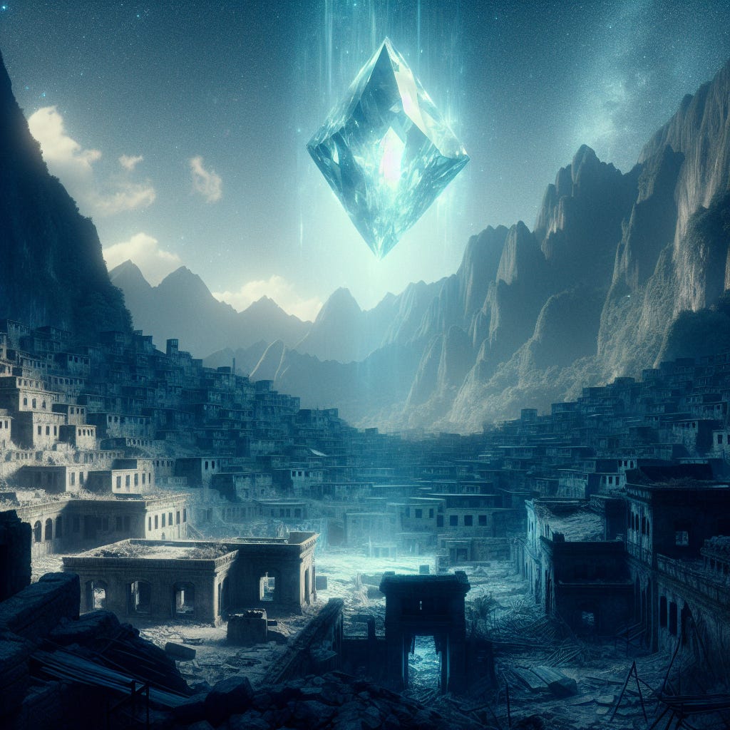 Venturing further into the mountains, the ruins of an ancient city known as Estadant lie hidden beneath the rocky terrain. Once a thriving metropolis, its buildings—crafted from cut stone and adorned with intricate patterns—now stand in silent decay. An eerie glow emanates from a massive floating blue crystal that hovers above the city, casting an otherworldly light upon the remnants of a forgotten civilization. At the city's heart, a colossal stone archway looms, beneath the crystal's dimmed radiance. In its center lies an empty pool, a relic of purpose long lost to time. What secrets does this city hold? What fate befell its inhabitants? The answers remain shrouded in mystery.
