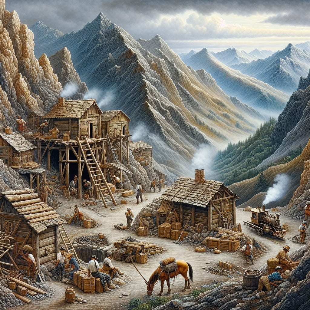 A path leading from Tiryn winds through the verdant forest and up toward the mountains, where a small mining camp, Grooten, awaits. This crude outpost is surrounded by a sturdy fence, enclosing four functional buildings: sleeping quarters for the Dwarven miners, a modest dining hall, a storage facility, and a barn for livestock. The well-worn tracks reveal the constant ebb and flow of supplies brought in and out by wagon, hinting at the camp's significance amid the encroaching darkness.