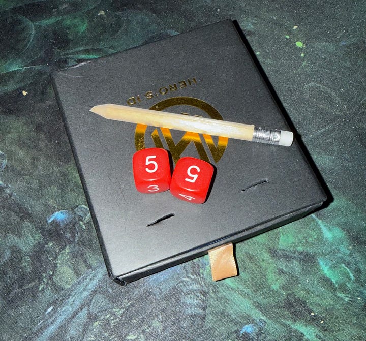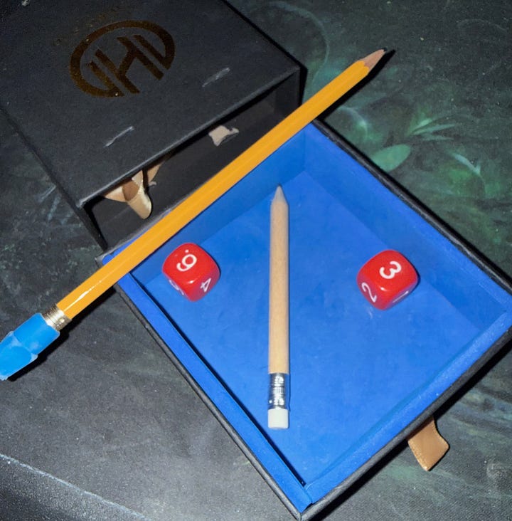 Anyway, I cut it to the size of the box, added four pieces for the sides, so the dice wouldn’t make much noise when rolling. If you look at the pictures above, you can see I’ve included a normal pencil and then another picture with some dice in the box so you can see the scale of it. So far, this little box has been great; the dice do not bounce, as I’ve glued everything in place. Let’s see how long it lasts.