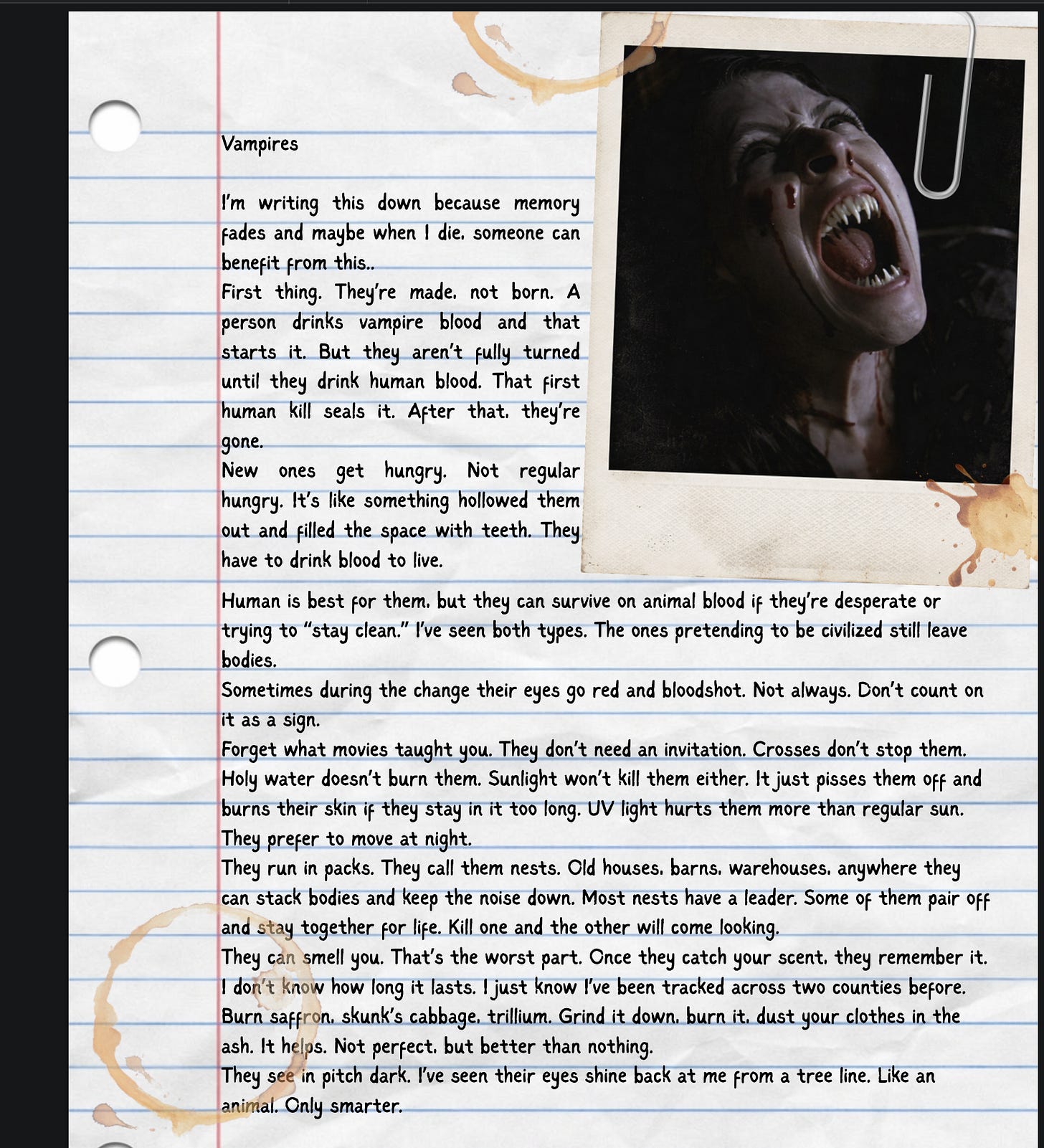This is just page one of the lore of this hunter who encountered vampires. I hope they enjoy this little βpropβ and find some value in it for the games to come!