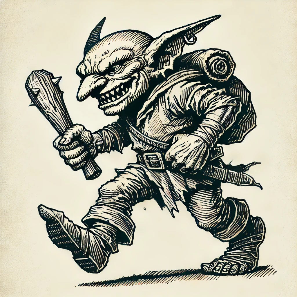 Brimstone Goblins are a particularly fiery and malicious breed of goblins, known for their penchant for explosives and fire-based tactics. Their skin is a dark, soot-streaked green, and their eyes burn with an unnatural orange glow, as though they’ve absorbed the very flames of hell. These goblins are more unpredictable than their cousins, using firebombs and other incendiary devices in combat to sow chaos and destruction. They tend to live in areas where sulfuric or volcanic activity is common, such as underground caverns near magma flows or deep in the heart of scorched forests. Often, they work in small, guerrilla-style bands, ambushing travelers or raiding villages and towns. Brimstone Goblins are notorious for causing wildfires in forests or stealing from pyromancers and alchemists to obtain rare flammable materials.