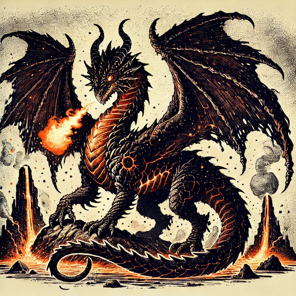 The Emberclaw Dragon is a rare and powerful dragon known for its fiery breath and molten powers. Its scales are dark, with veins of bright orange and red running through them, and its eyes glow with a fierce light. Unlike other dragons, the Emberclaw has special heat-sensitive claws that can create bursts of flames with every swipe. This dragon usually lives in volcanic areas, high mountains with lava flows, or deep underground near sources of heat.
